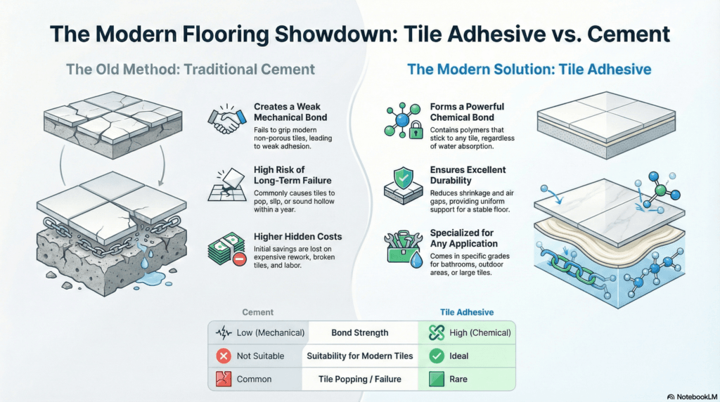 Modern tile adhesive surpasses traditional cement for fixing vitrified and porcelain tiles. While cement lacks grip on non-absorptive surfaces, adhesives use polymers to create a strong chemical bond. This prevents tile popping and ensures long-term durability.